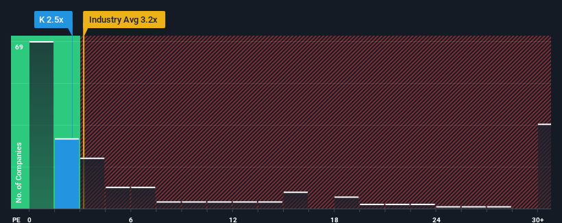 With a price-to-sales (or “P/S”) ratio of 2.5x Kinross Gold Corporation (TSE:K) may be sending bullish signals at the moment, given that almost half of all the Metals and Mining companies in Canada have P/S ratios greater than 3.2x and even P/S higher than 17x are not unusual. However, the P/S might be low for a reason and it requires further investigation to determine if it’s justified.
