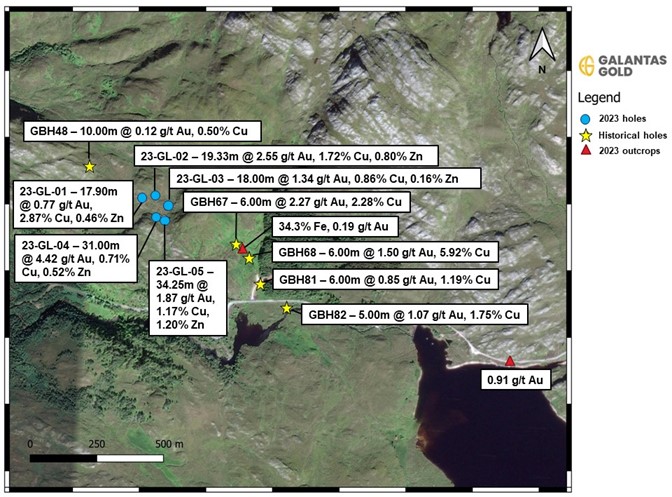 • Hole 23-GL-05 intersected 1.87 grams per tonne (g/t) gold (Au), 1.17% copper (Cu), 1.20% zinc (Zn), 131 g/t cobalt (Co) and 7.06 g/t silver (Ag) over 34.25 metres with new mineralization identified a further 100 metres at depth.