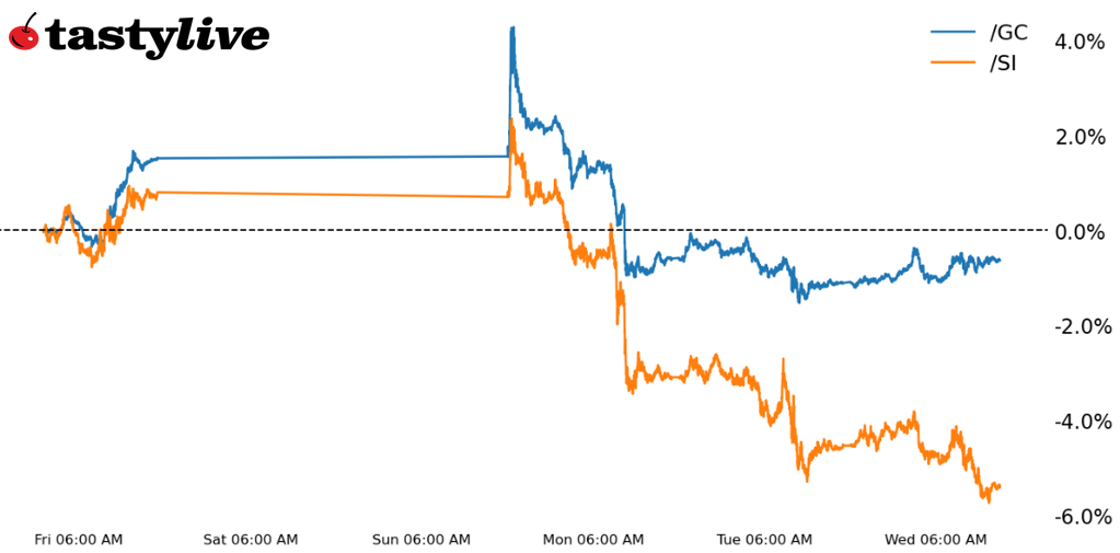 What caused the spike and collapse? Maybe it was a fat finger, maybe it was the result of stop orders getting cleared out, maybe it was fear around weekend headlines about conflict in the Red Sea. Context matters, but the price action speaks for itself: /GCG4 and /SIH4 have turned solid gains into meaningful losses at the start of December.