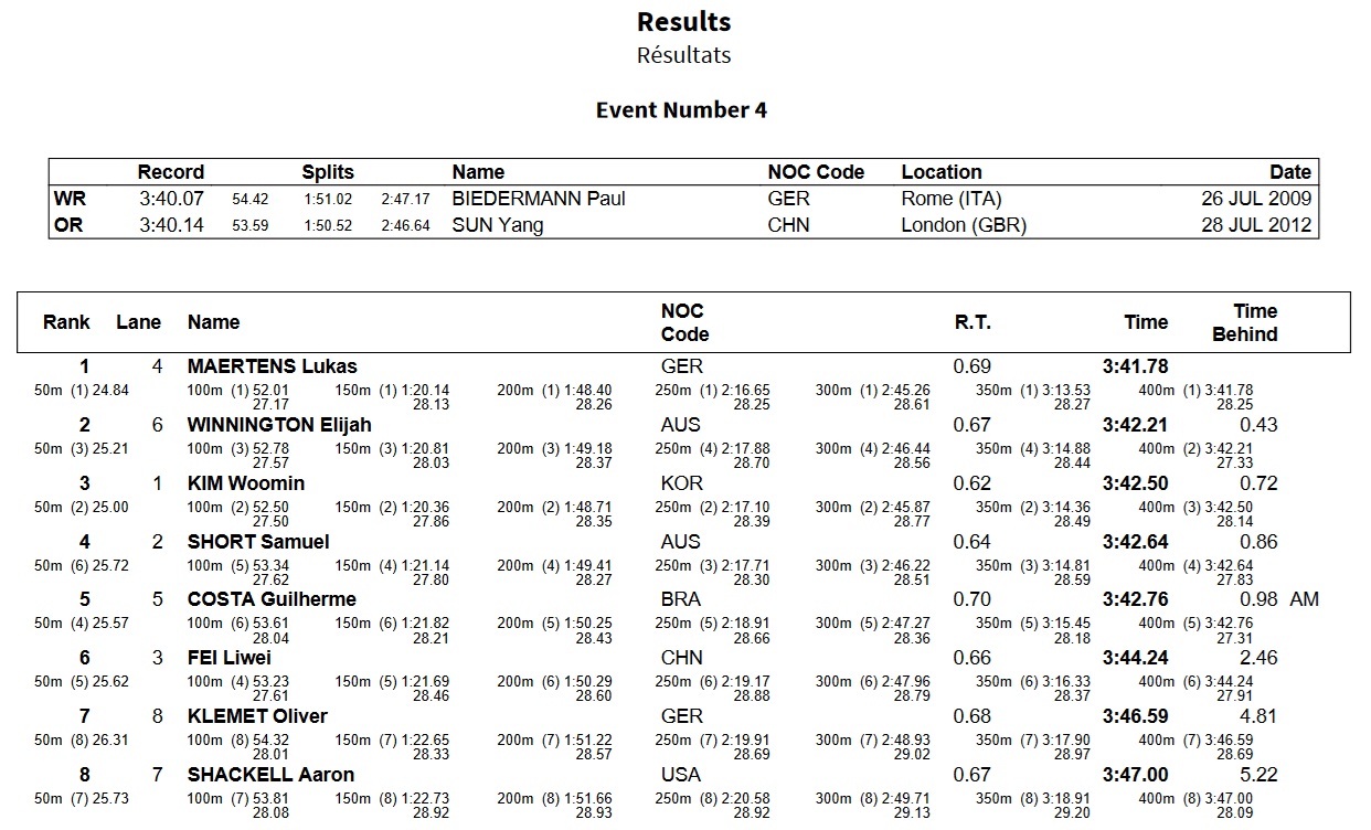 In fifth was Guilherme Costa of Brazil in 3:42.76. That takes down Larsen Jensen’s mark of 3:42.78 from the 2008 Olympics. Fei Liwei of China was sixth, with American Aaron Shackell eighth.